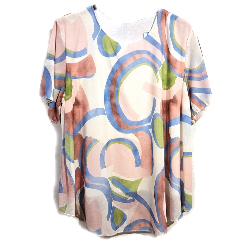 Zelo elegantna tunika s kratkimi rokavi. Tunika ima všito raztegljivo majico, vrhnji del pa je pisano prosojno blago. Kroj tunike je A, kar pomeni, da je primerna tudi za širše boke.